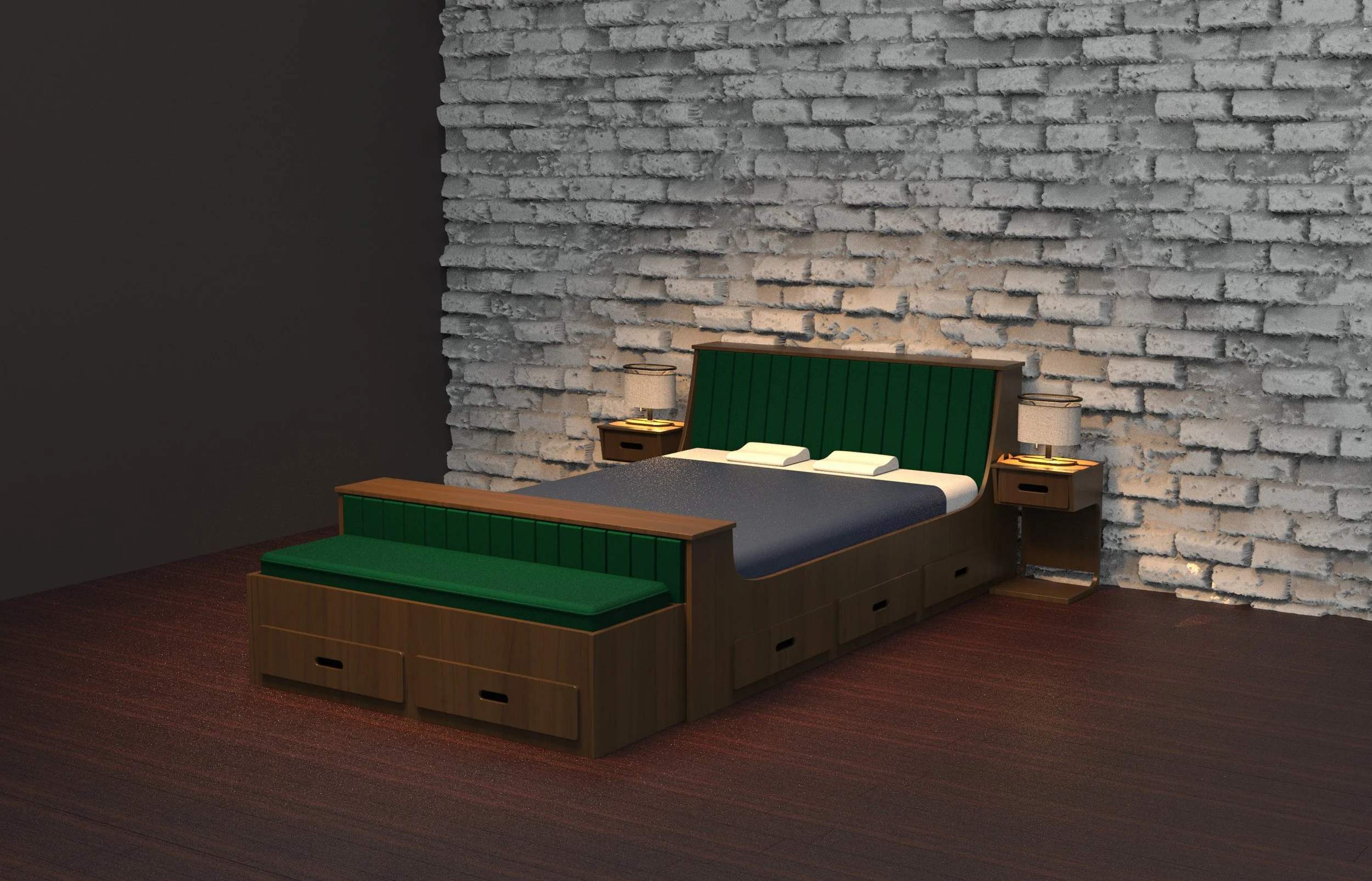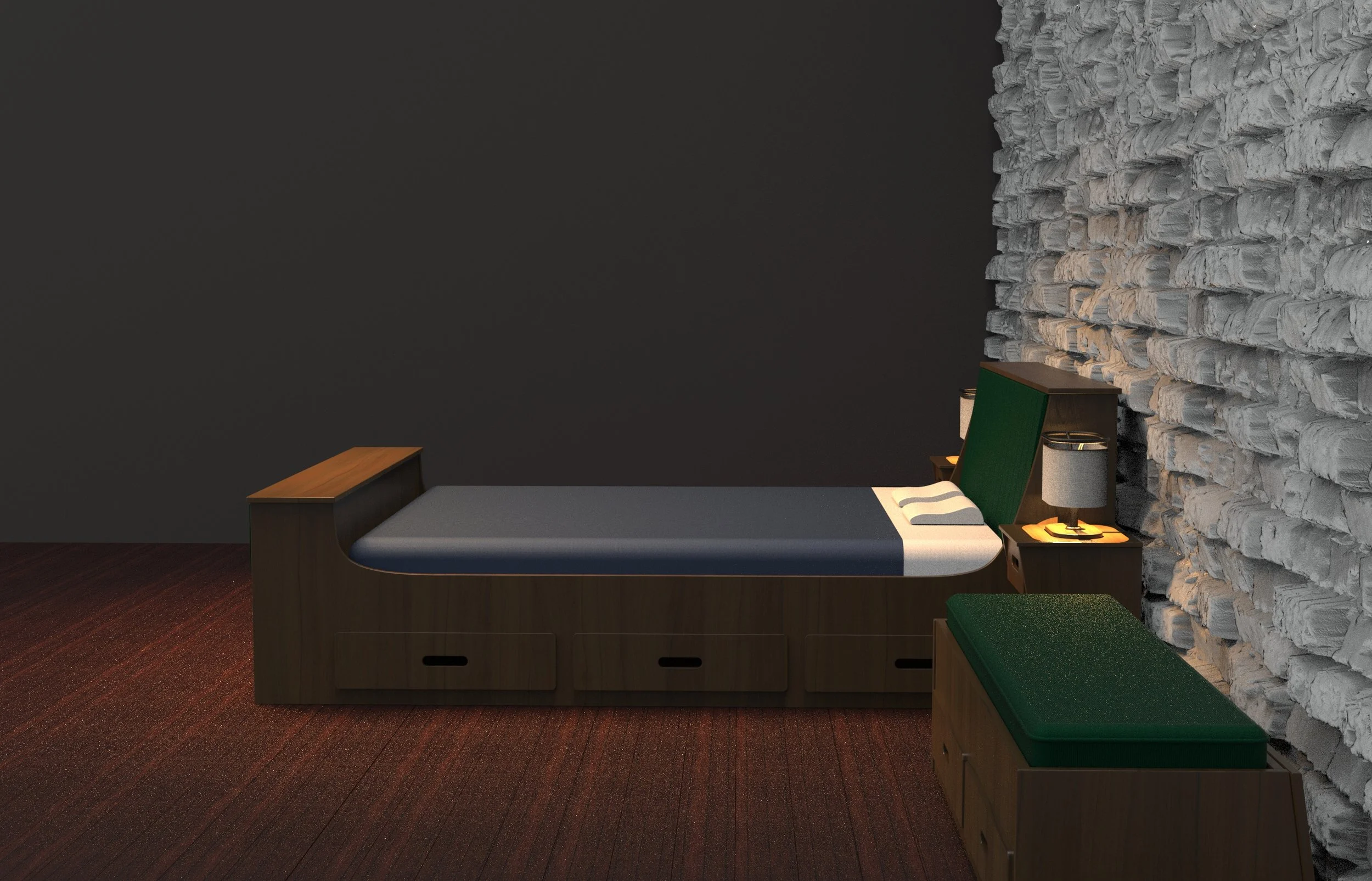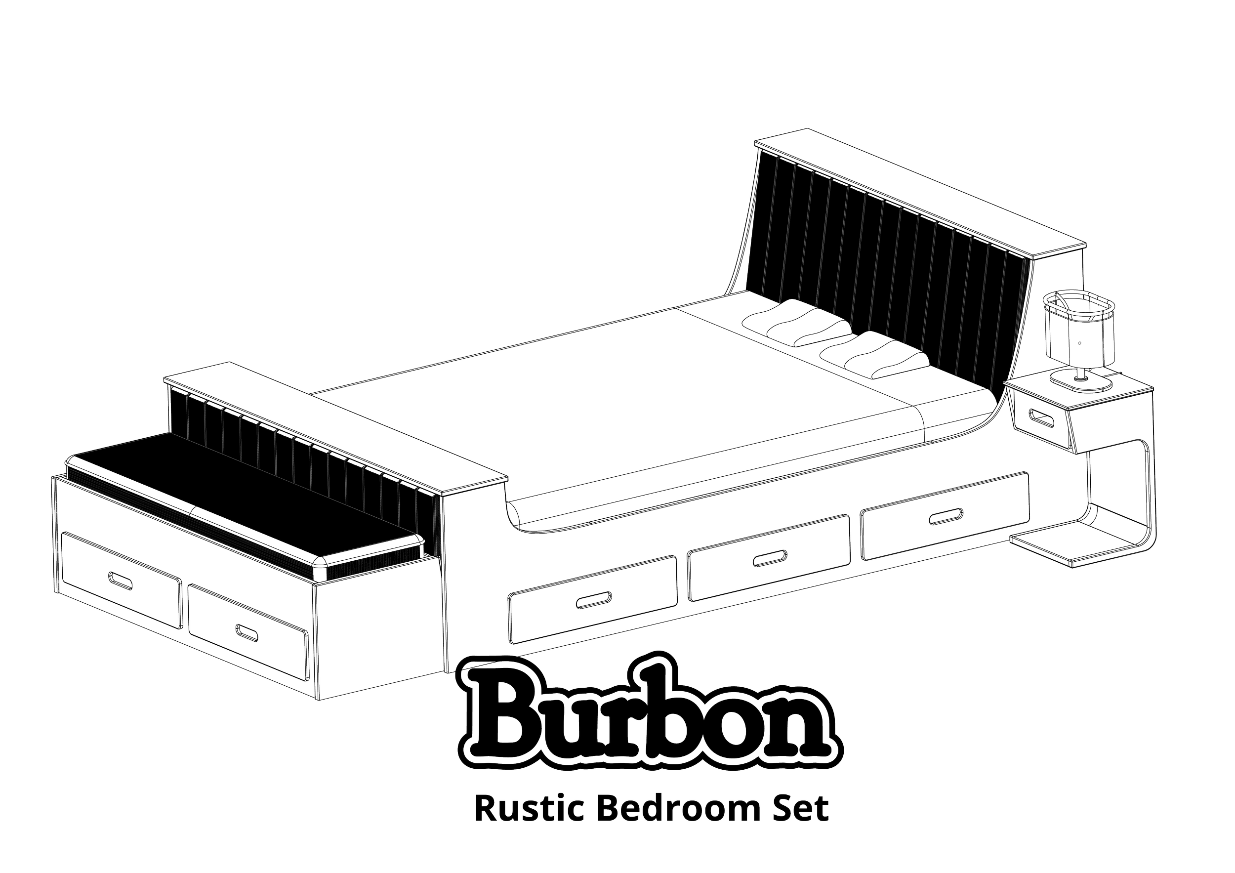 BurbonFurniture Design | 2022Rustic furniture set. Flat pack bedframe, nightstand, corduroy accents, and bedside lamp.