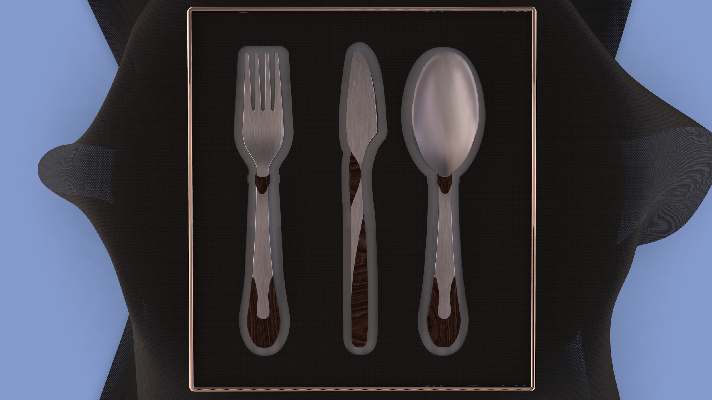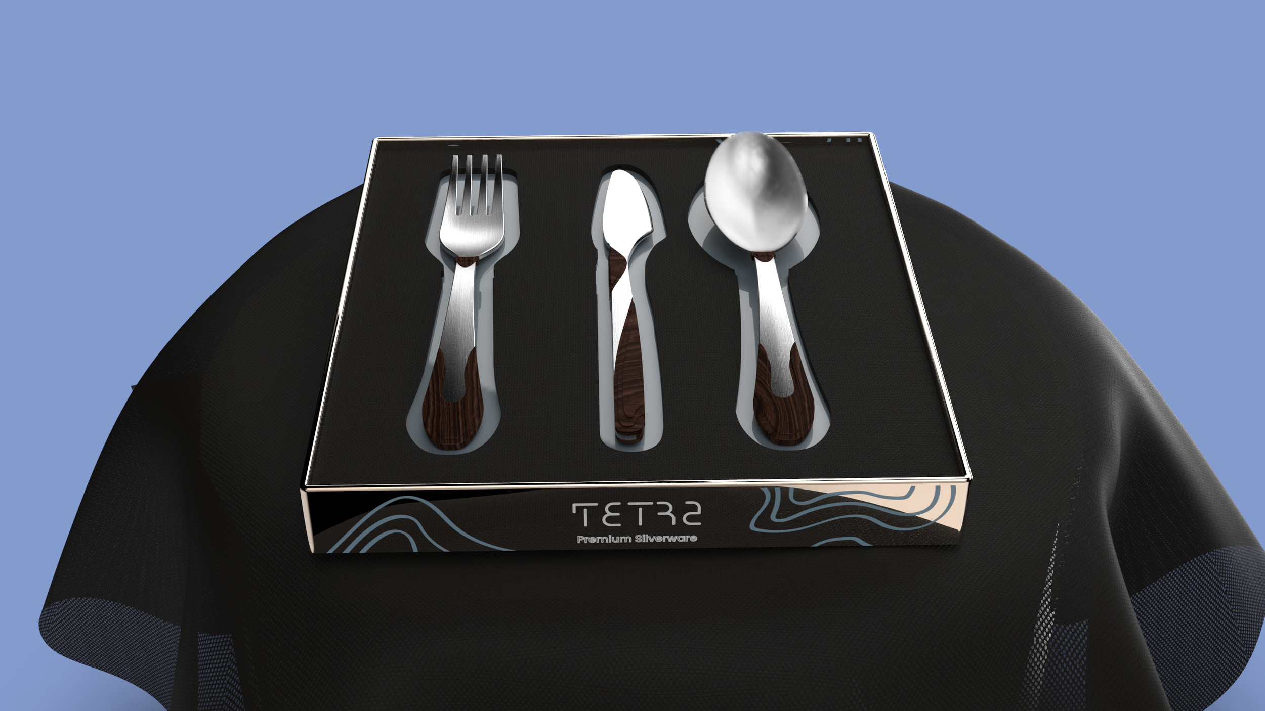 Tetra SilverwareHouseware Design | 2022Silverware inspired by maps showcasing the coastline. Topographic walnut details with stainless steel.